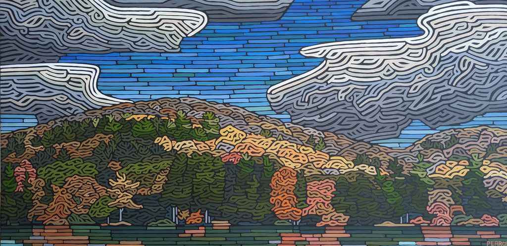 Now, in her labyrinth series, Pearce’s landscapes reflect the connectedness in nature. All elements are constantly moving, be it a rushing waterfall, a cloud filled sky or even the infinitesimal movement of rock formation. Here, she finds inspiration during her morning ritual, paddling the waters and walking the trails at her cottage on the edge of Algonquin Park as well as in Muskoka, the Kawarthas, and the length of Bruce Trail’s waterfalls, cliffs and forests.