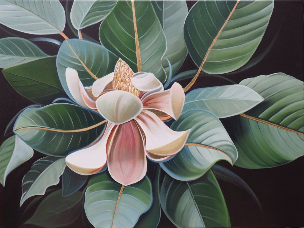 Working in oil on large canvases, I focus on soft, layered brushwork balanced with bold negative space. My background in graphic design influences how I approach composition—shaping each bloom with intention, rhythm, and scale. I’m drawn to that space where realism meets stylized abstraction, where nature feels both familiar and newly seen.