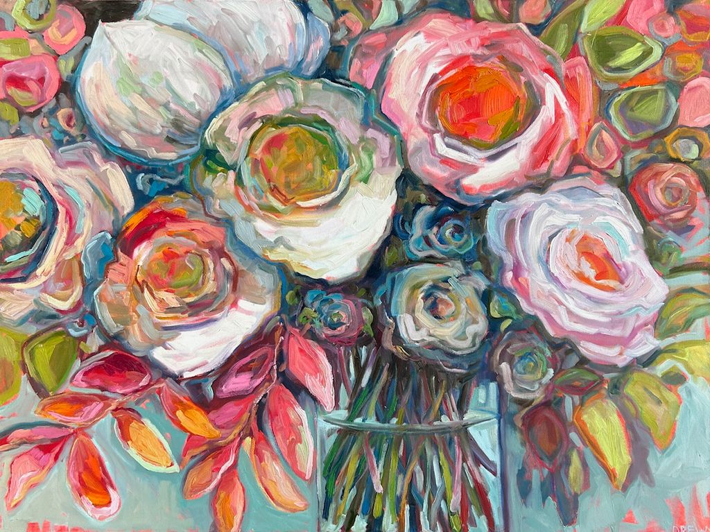Vanessa Drew is a Burlington based artist who works with acrylic paint. She finds inspiration in putting paint and brush to canvas, the physicality of art making. She uses rich and bold colours to create floral interpretations which are represented in several galleries across Canada.