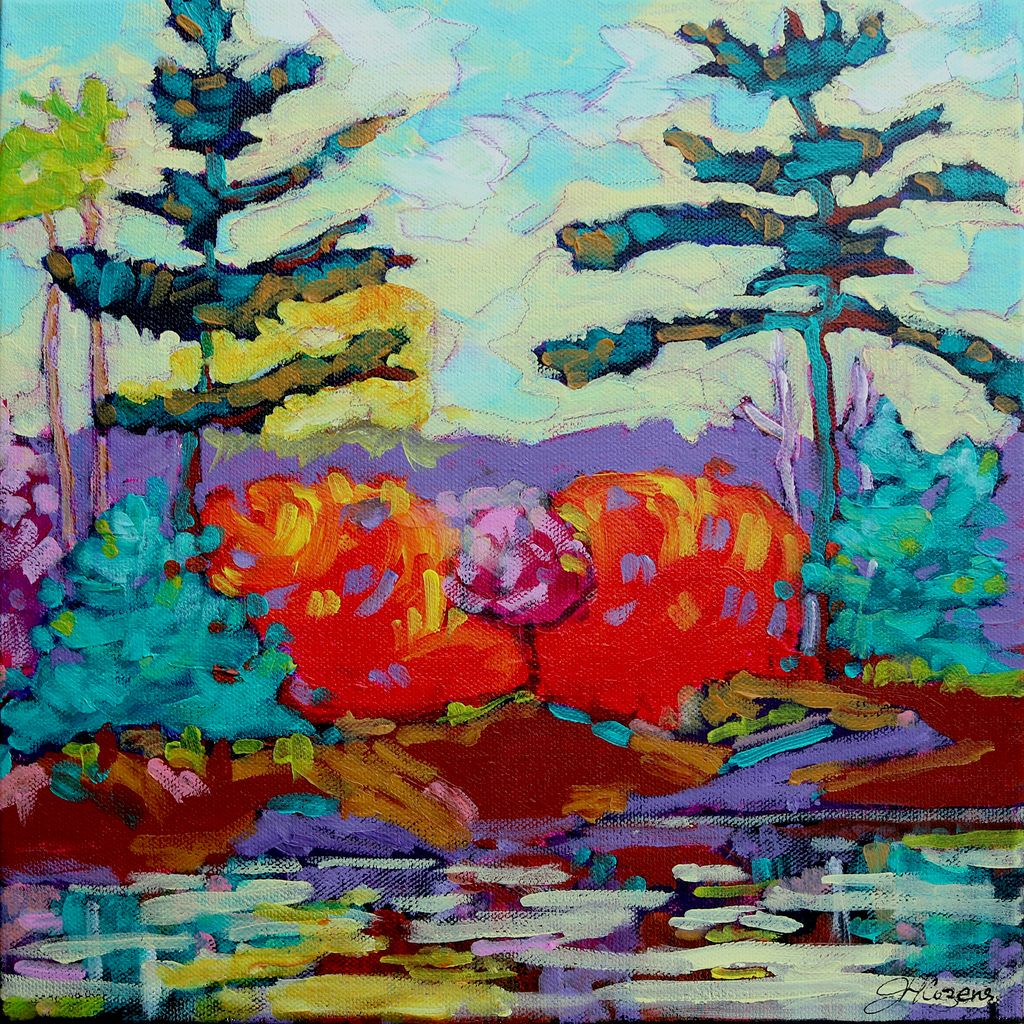 Janet Horne Cozens began studying art at the age of two in Japan and continued after her family immigrated to Northern Ontario. She is a graduate of Music Performance from the University of Toronto and Fine Arts from the Ontario College of Art. Her work explores the relationship between the natural world and us, the viewers, using colour, texture and shape. With influences from the Group of Seven, First Nations artists and her own background as a printmaker, Cozens has developed a style that reflects not only what the viewer expects to see in these landscapes, but also the hidden influences of people on these views through the unexpected use of man-made pigments.