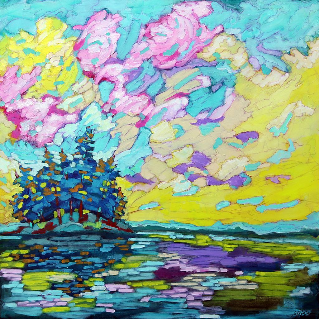 Janet Horne Cozens began studying art at the age of two in Japan and continued after her family immigrated to Northern Ontario. She is a graduate of Music Performance from the University of Toronto and Fine Arts from the Ontario College of Art. Her work explores the relationship between the natural world and us, the viewers, using colour, texture and shape. With influences from the Group of Seven, First Nations artists and her own background as a printmaker, Cozens has developed a style that reflects not only what the viewer expects to see in these landscapes, but also the hidden influences of people on these views through the unexpected use of man-made pigments.