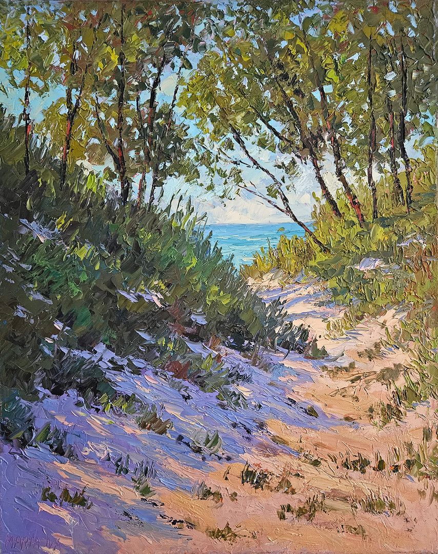 Maria Iva is a landscape painter, who through the use of a palette knife, works in an impressionistic manner and employs a colourist approach. A nature lover and tireless hiker, Maria finds inspiration in exploring the provincial parks and conservation areas of Southern Ontario. Often sketching on location with dry pastels, she captures the light and feeling of each scene before creating her larger oil works in studio. The result is a series of textured pieces that celebrate the beauty of nature. Maria has participated in many exhibitions and juried shows and in 2023 wrote the article, “Sculpturing the Paint” featured in International Artist Magazine.