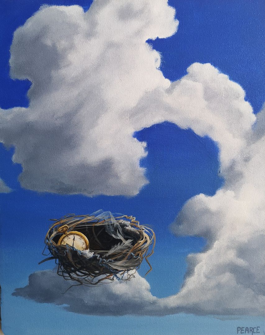 Victoria’s dramatic skies have long been her signature, inviting the viewer to consider the heavens whether filled with sculptural florals or floating nests. Flowers painted from the perspective of an ant provide striking contrast to the clouds that frame these still life images.