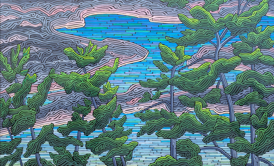 Now, in her labyrinth series, Pearce’s landscapes reflect the connectedness in nature. All elements are constantly moving, be it a rushing waterfall, a cloud filled sky or even the infinitesimal movement of rock formation. Here, she finds inspiration during her morning ritual, paddling the waters and walking the trails at her cottage on the edge of Algonquin Park as well as in Muskoka, the Kawarthas, and the length of Bruce Trail’s waterfalls, cliffs and forests.